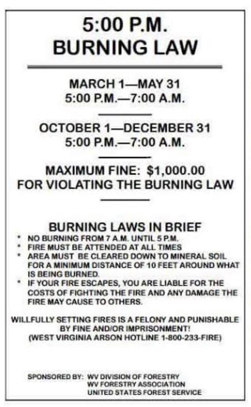 Starting March 1, burning bans will be in effect in Berkeley County, West Virginia, from 5:00 p.m. to 7:00 a.m. Residents planning to start a brush fire should contact the Berkeley County 911 Center using the business line at 304-263-1330 before proceeding. Extra precautions are advised due to current drought conditions.
