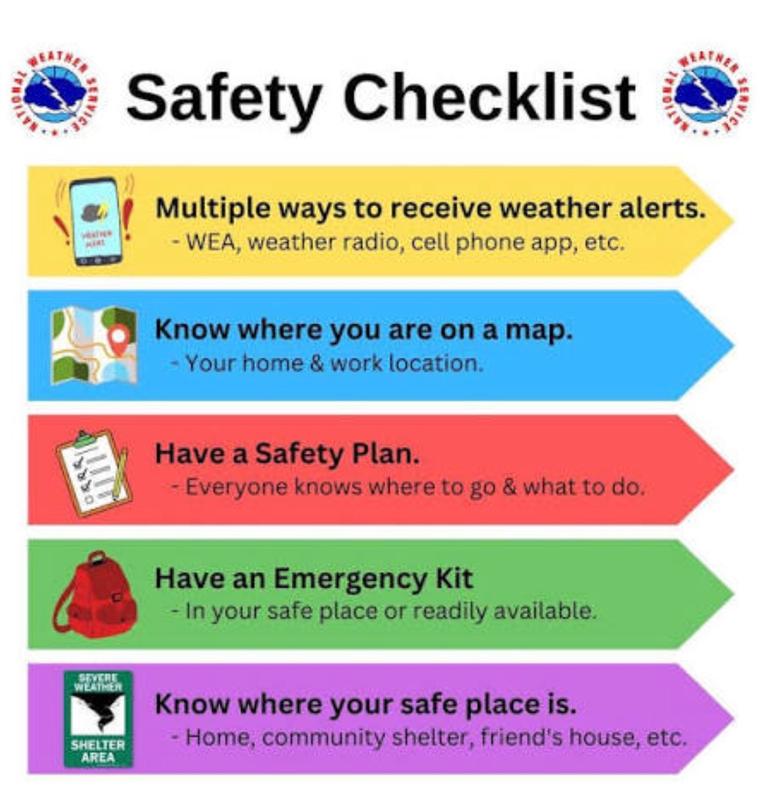 • Where to shelter during high winds or tornado warnings • How to evacuate if flooding threatens • Who to contact if separated • How to assist elderly family members or neighbors